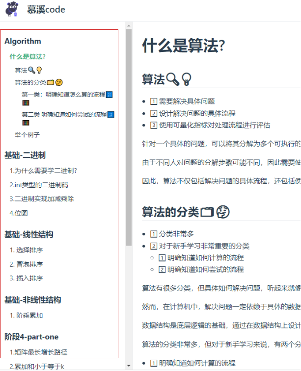 本站中,算法专栏的页面示例,左侧是侧边栏,可直接跳转: