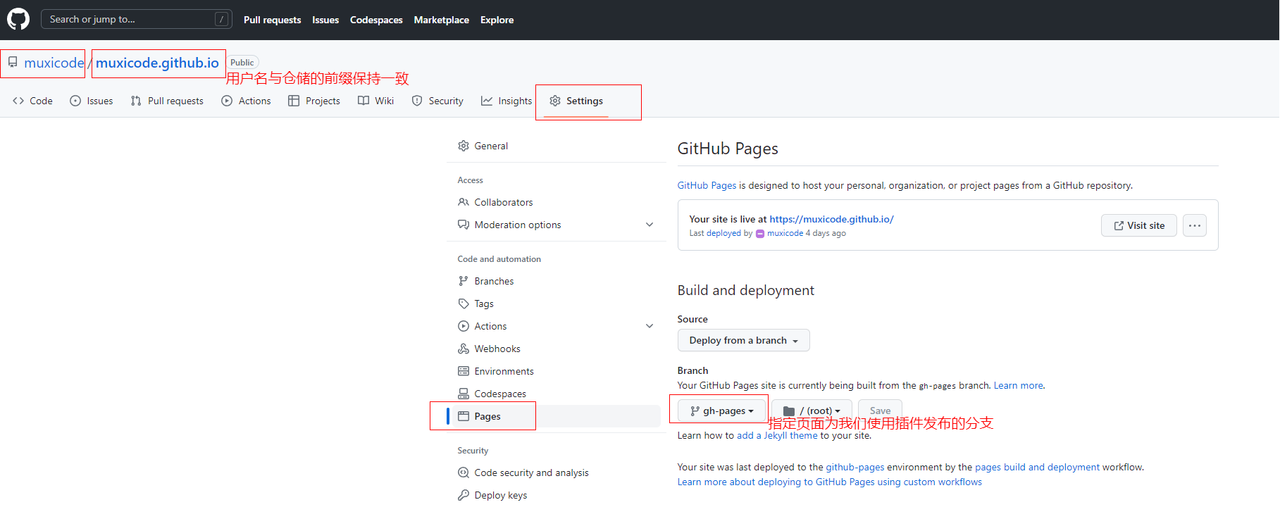 npm run deploy:build该命令将项目构建,并使用插件将构建文件添加到 gh-pages 分支👉 修改你想展示个人页面的分支到 gh-pages