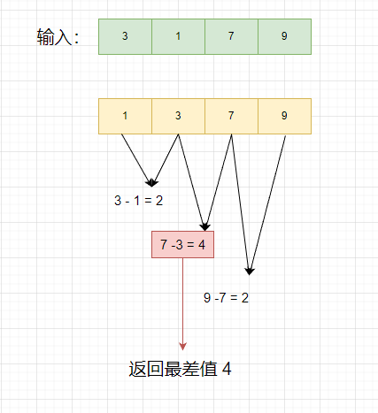 {3,1,7,9}, 如果排序后 {1,3,7,9},相邻数之间的最大差值来自3和7,返回4