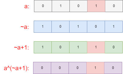 假设我们有一个数字a,我们使a异或上a取反加1后可以得到a的二进制上最右边的1,即:rightOne = a ^ (~a + 1)