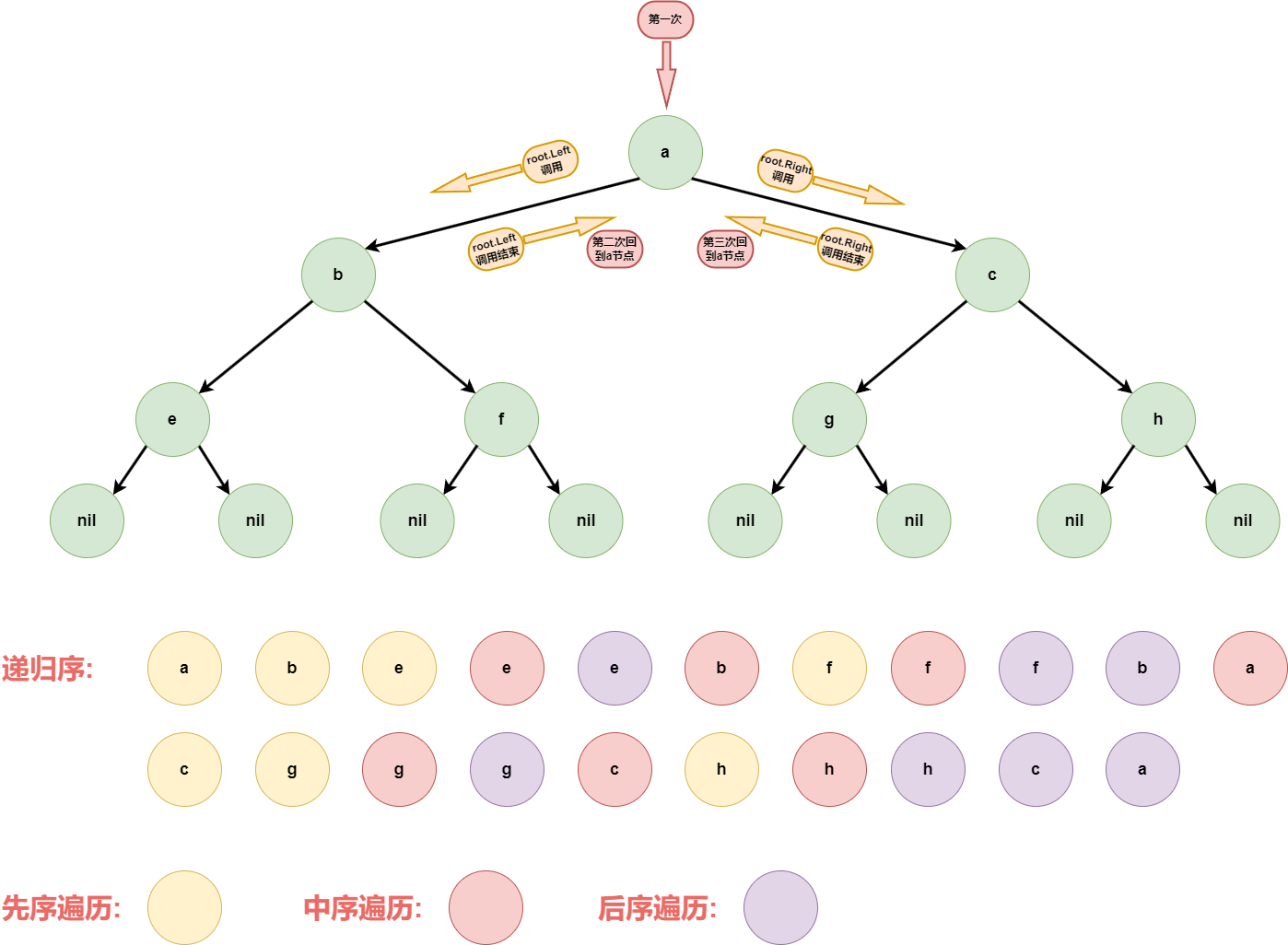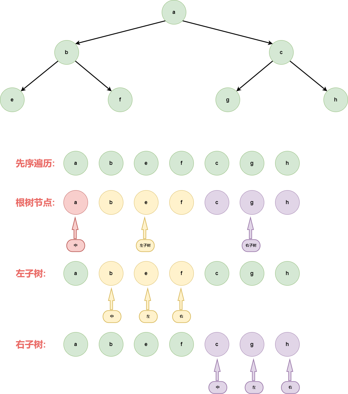 **前序遍历(Pre-order Traversal):**任何子树的处理顺序都是,先头节点、再左子树、然后右子树