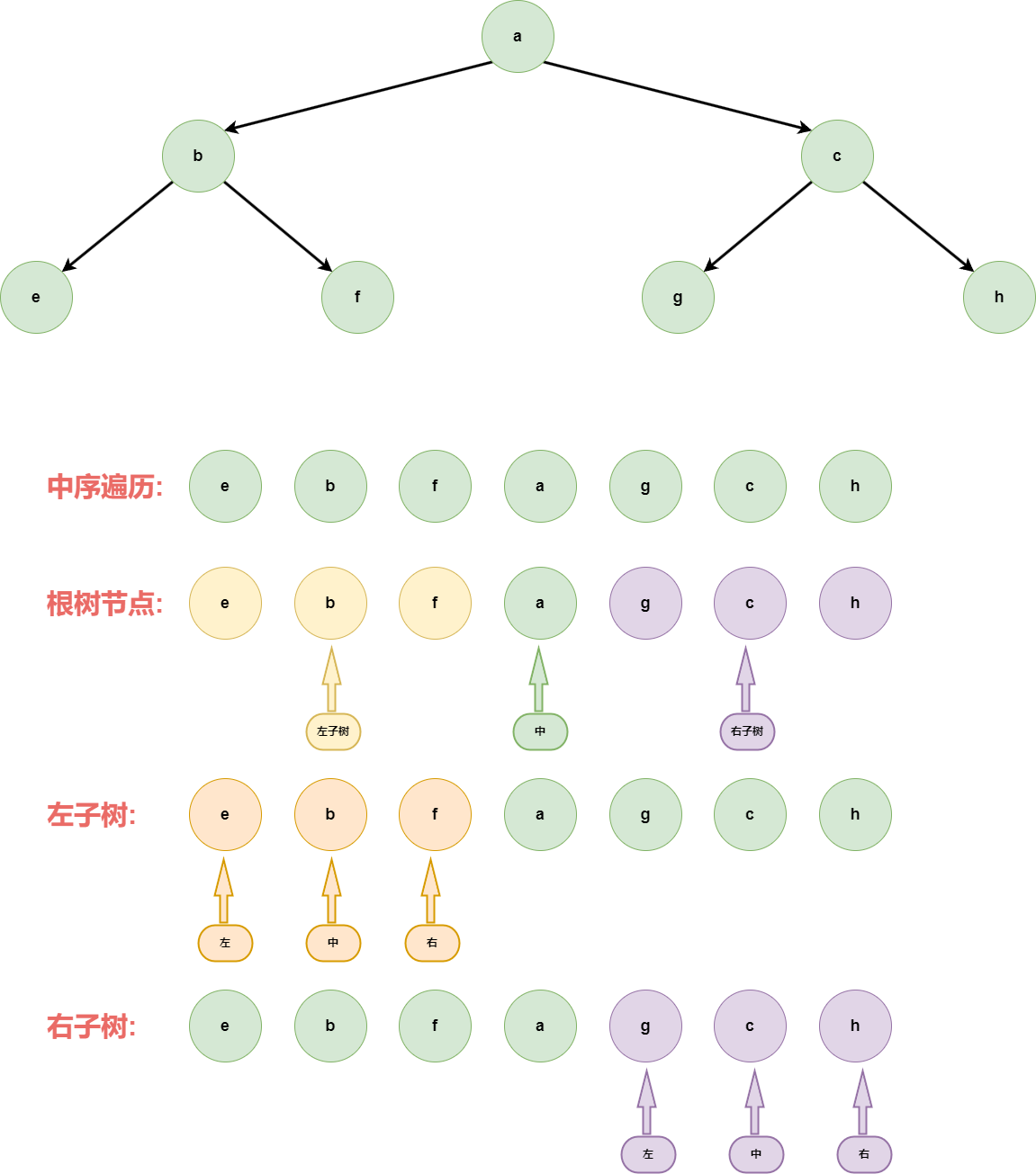 2. 中序遍历(In-order Traversal): 任何子树的处理顺序都是,先左子树、再头节点、然后右子树