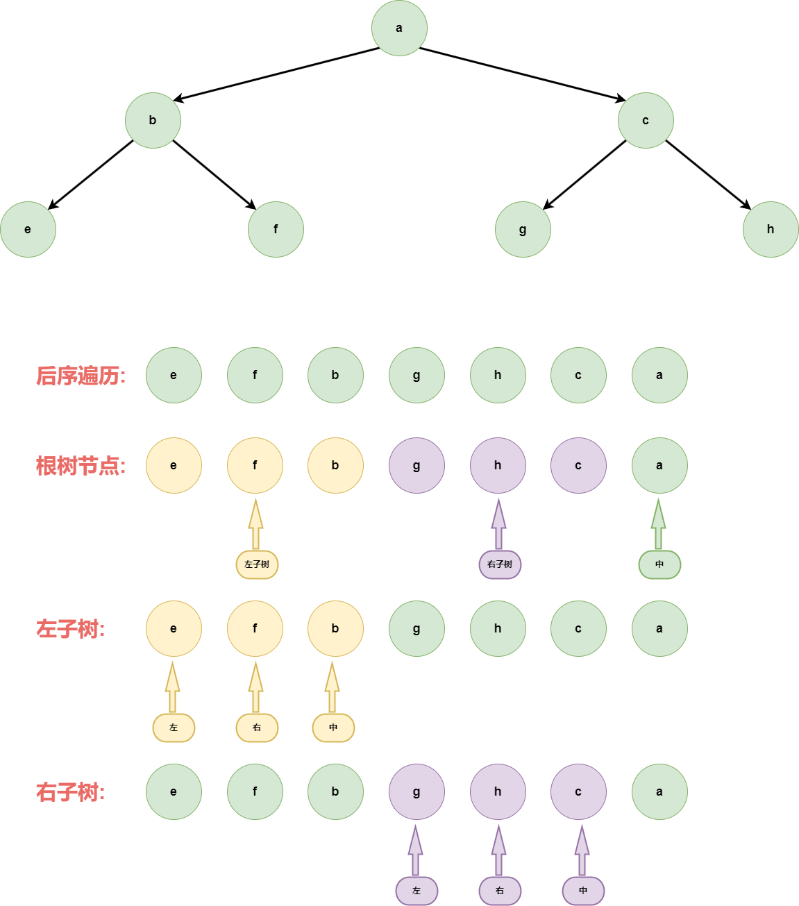 3. 后序遍历(Post-order Traversal): 任何子树的处理顺序都是,先左子树、再右子树、然后头节点