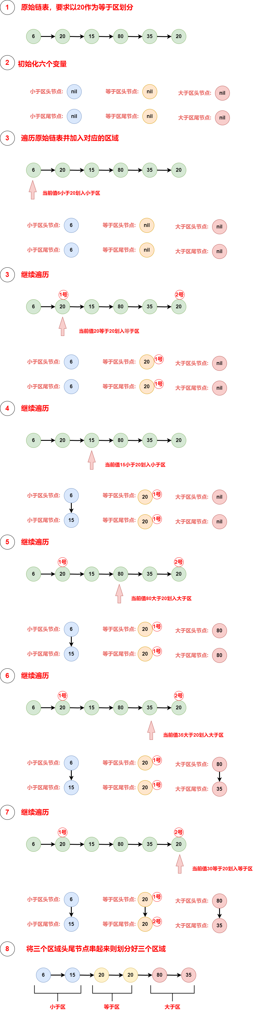 将单向链表按某值划分成左边小、中间相等、右边大的形式,可以使用下面 两种方式: