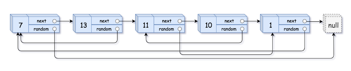 请实现 copyRandomList 函数,复制一个复杂链表。在复杂链表中,每个节点除了有一个 next 指针指向下一个节点,还有一个 random 指针指向链表中的任意节点或者 null。