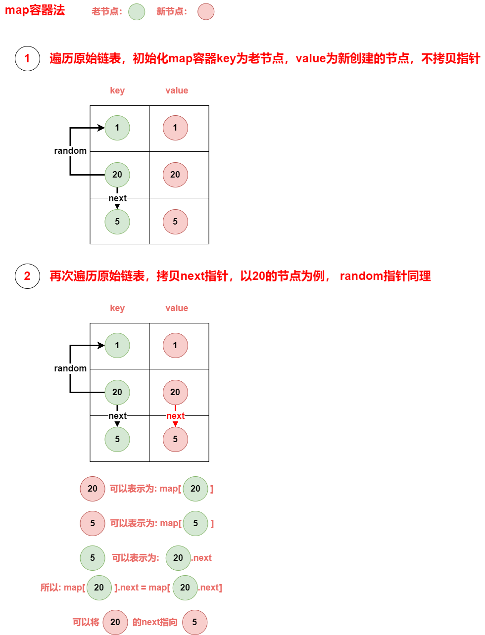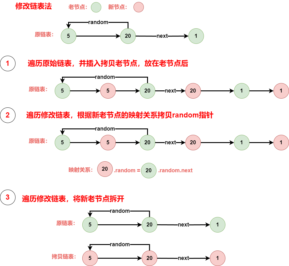 - 再次遍历原始链表的节点,分别执行步骤二的表达式,拷贝老节点的引用到新节点上