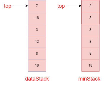 minStack栈顶的值,如果小于,则插入当前值到dataStack和minStack,否则dataStack插入数据,minStack则重复插入当前最小值 - 优化:可以不重复插入最小值,弹出元素的时候判断是否是最小值出栈,如果是的话