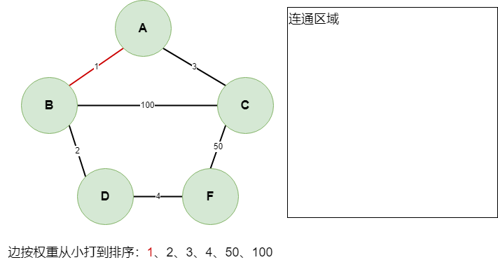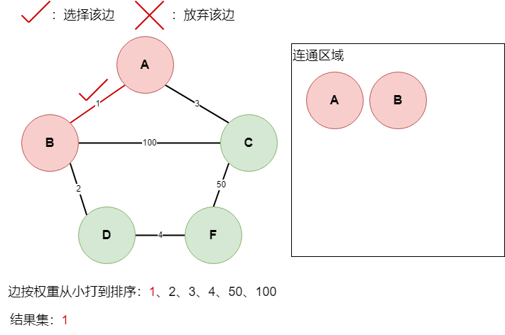 遍历最小权值边1时,两边的 A点B点此时并未连通,所以选择该边,此时 A点B点连通,加入连通区,边1加入结果集,如下: