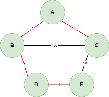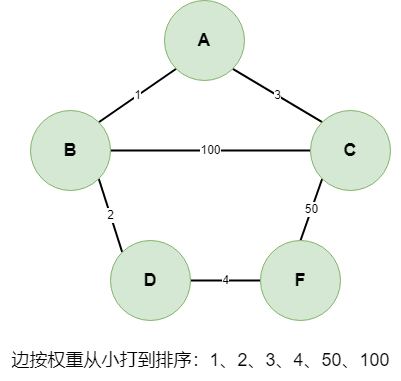 2. 继续遍历,遍历到边100,此时,C点B点,已经有由边3边1连通在一起,所以放弃边100,结果集不变。自此,我们遍历完所有的边,收集到结果集,最小权重即为结果集的边的权重相加。