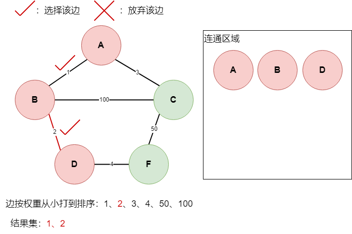 此时遍历到边2时,两边的 B点D点此时并未连通,所以选择该边,此时 B点D点连通,加入连通区,边2加入结果集如下: