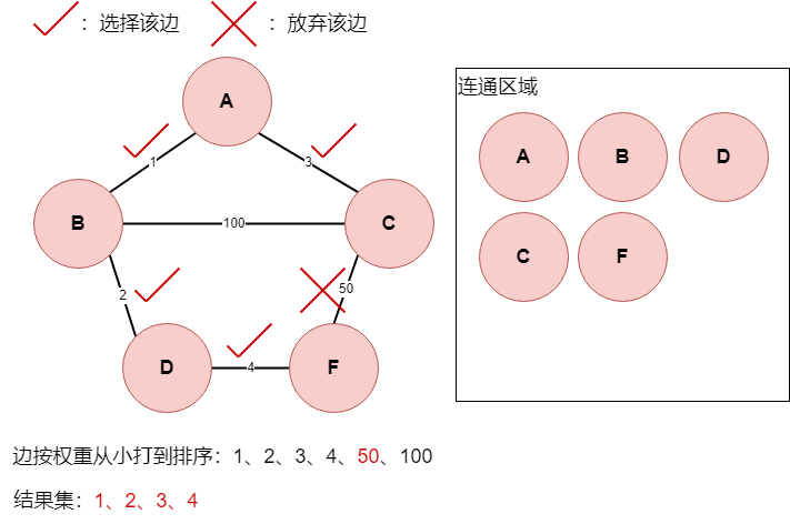 1. 继续遍历,遍历到边50,此时,C点F点,已经有由边3边1边2边4连通在一起,所以放弃边50,结果集不变。
