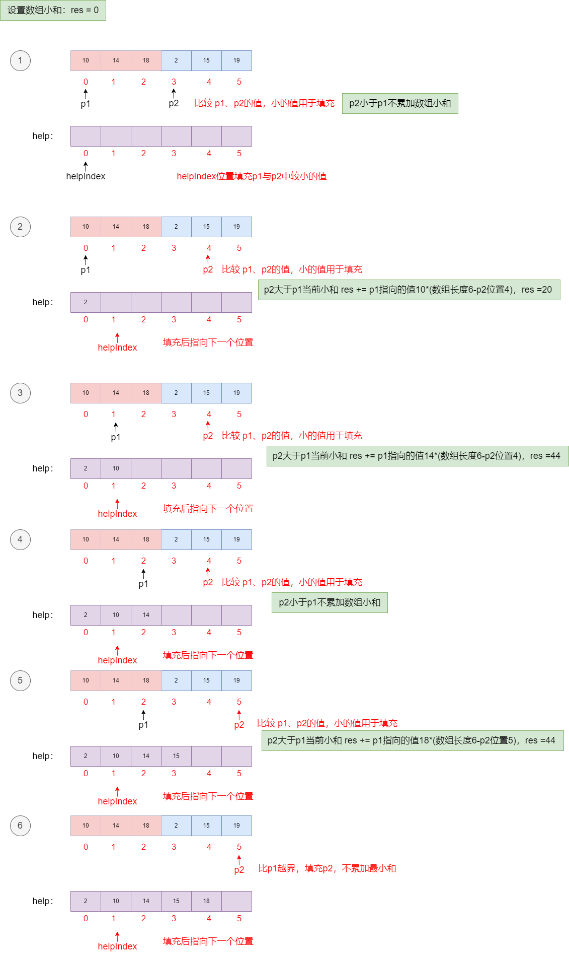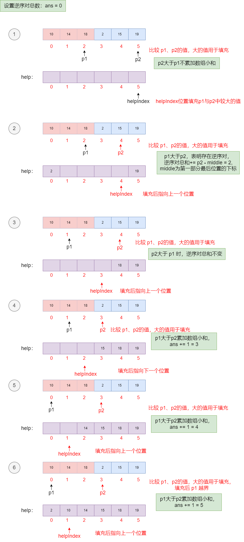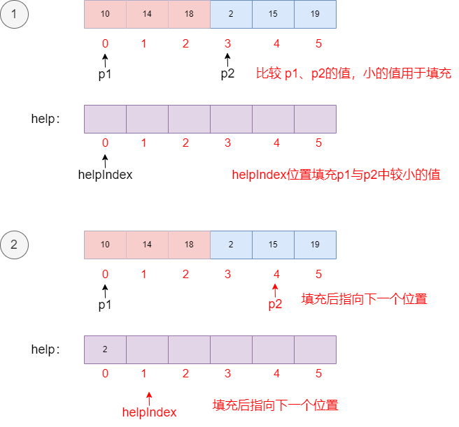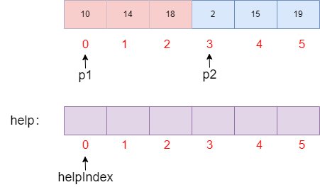 p1指向前半部分的有序数组的开头位置p2指向后半部分的有序数组的开头位置help为辅助数组,用于将两部分的数组重新整理有序helpIndex指向当前需要填充数字的位置