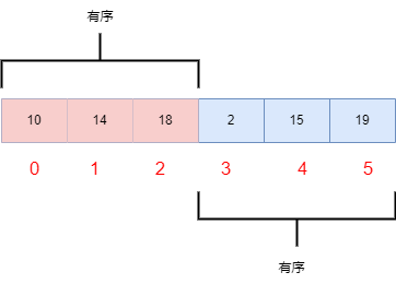 我们有一个数组,前半部分有序,后半部分也有序,但是整体无序如: