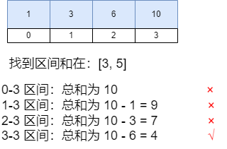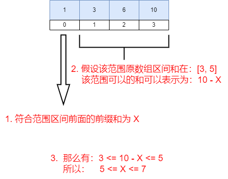 我们可以得到一个结论:对于 10 这个位置,只要之前有前缀和在 [5, 7]之间,就有对应的10为结束位置的区间在[3, 5]。