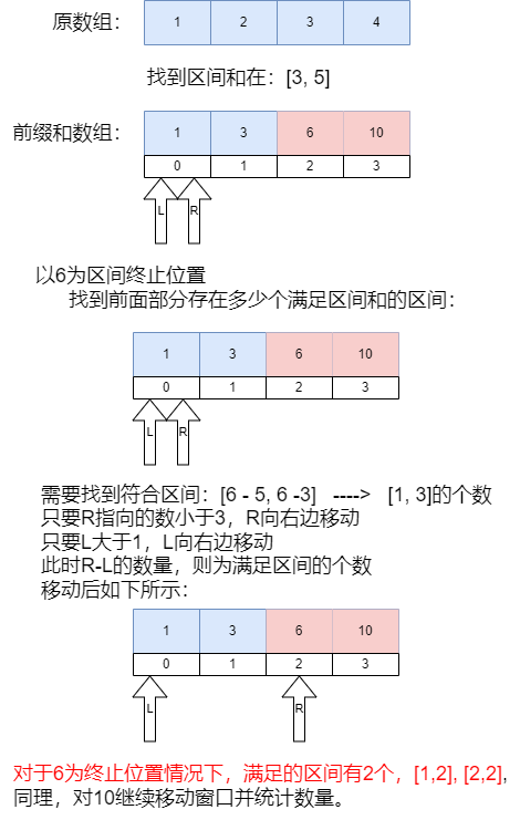 对于之前的问题,我们可以转化为,找到每一个结尾的位置,并找到以该结尾位置结尾的所有区间符合范围的个数,我们就将该问题解决了。