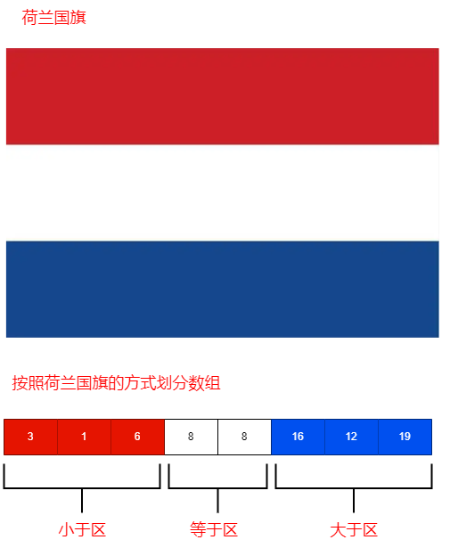 🧩 这次我们要用上述数组来玩转荷兰国旗划分。咱们的技巧是使用数组的最后一个数字,作为等于区域的标志数字。准备好了吗?这里要引入三个小助手: