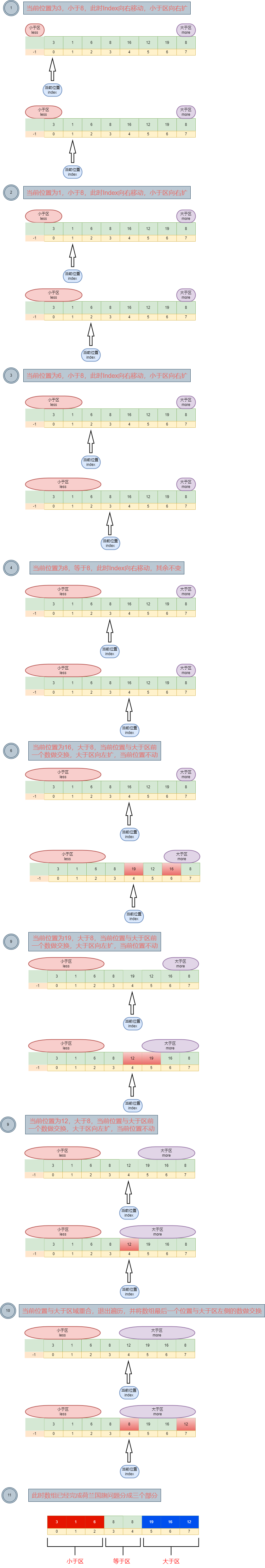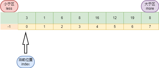 🚦 小于区域的位置 (less):一开始它在-1的位置,随着遍历的进行,它会向右不断扩张。