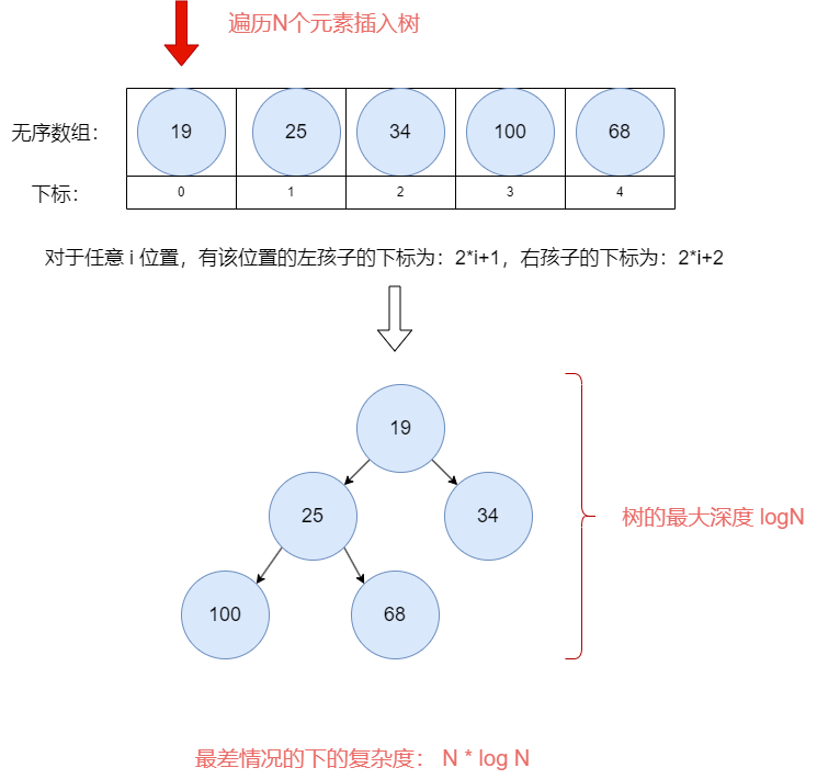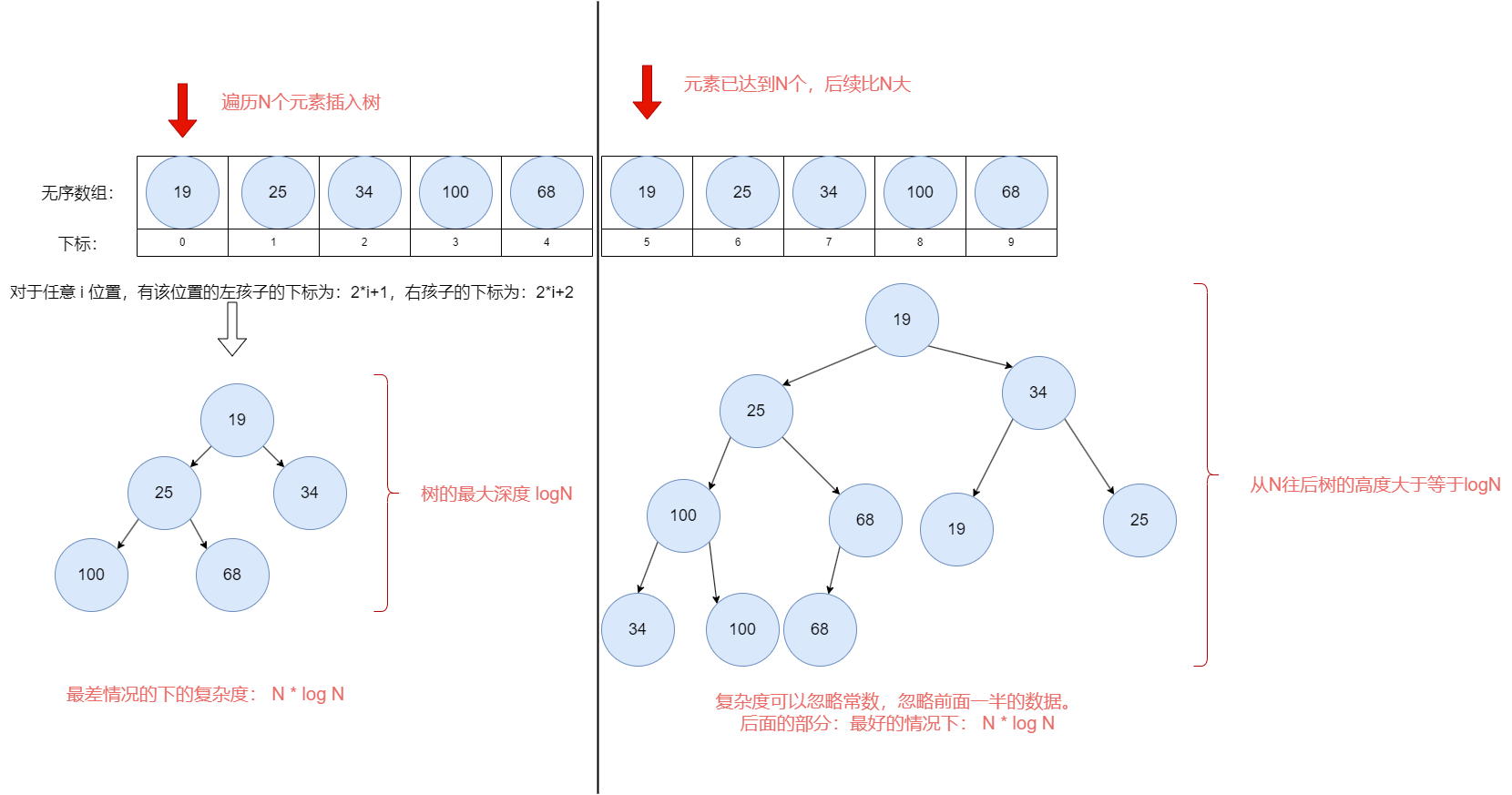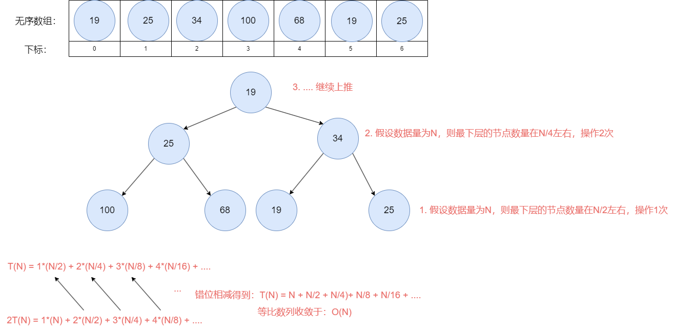heapify巧妙地选择了倒序建堆方式,其时间复杂度为:O(N)- 在这种策略下,从后往前的