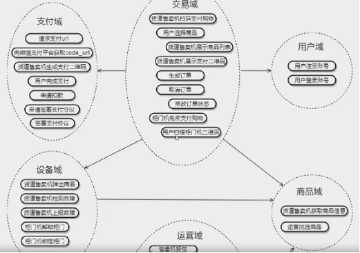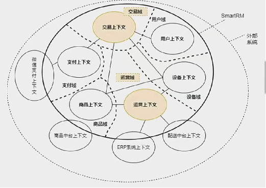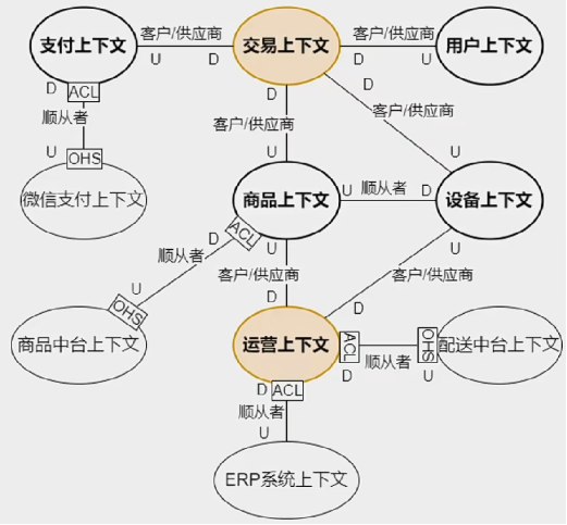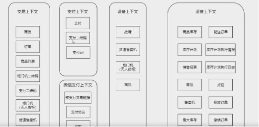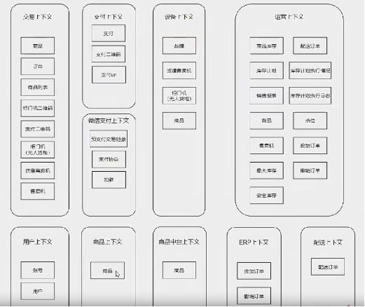 通过分别从各个子域的用户故事中提取关键概念,审视他们之间的关系,以及他们与外部系统之间的关系,我们可以梳理出系统中的限界上下文。如下图所示: