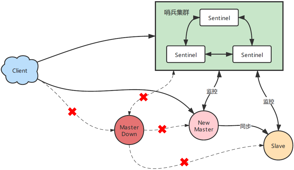 客户端连接Redis,会首先连接Sentinel,通过Sentinel查询master地址,然后再连接master进行数据交互。当master挂了,客户端重新跟Sentinel要master地址,连接新的master。