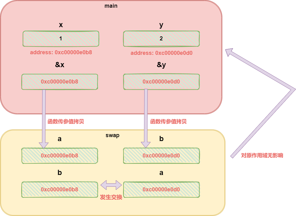fmt.Println("swap 后x的地址:", &x, "swap 后y的地址:", &y)