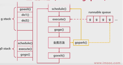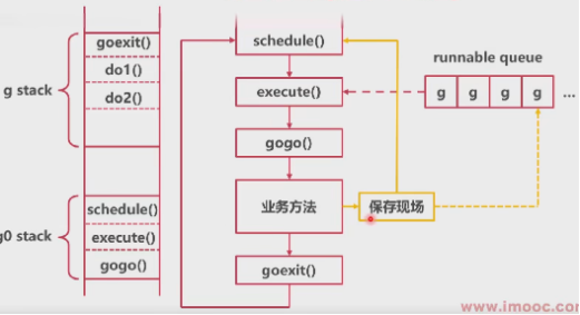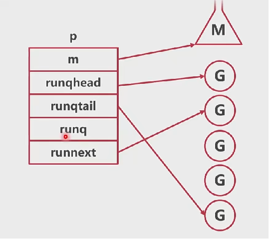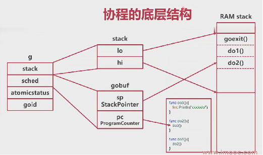 sched gobuf // 调度信息sp 栈指针(指向调用到的地方,不是方法本身),pc程序计数器,运行到了哪一行代码