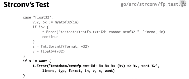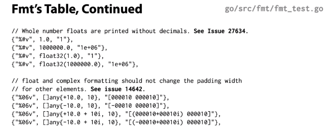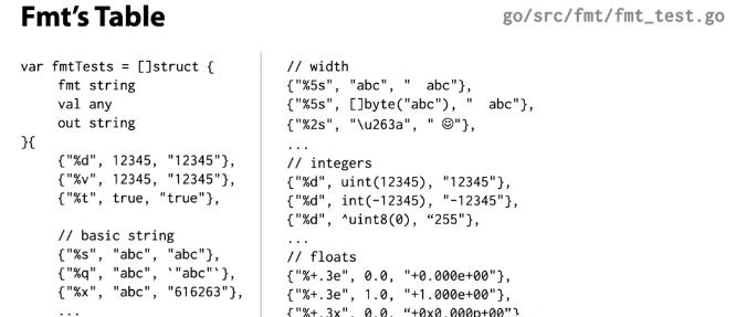 这是我最喜欢的一个测试表之一。它来自fmt.Printf的测试用例。每一行都是一个printf格式、一个值和预期的字符串。真实的表太大了,无法放在幻灯片上,但这里摘录了一些表中的代码行。