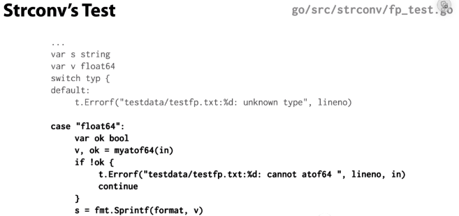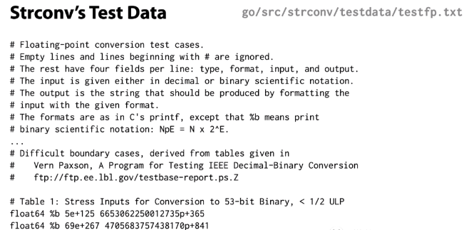 表格是将测试用例与测试逻辑分离并且方便添加新的测试用例的一种方法,但有时你会有很多测试,甚至写Go语法的开销也是不必要的。例如,这里是strconv包的一个测试文件,用于测试字符串与浮点数之间的转换。你可能认为编写解析器来处理这个输入太麻烦了,但一旦你知道了如何处理,其实并不需要太多工作,而且定义测试专用的小型语言实际上非常有用。