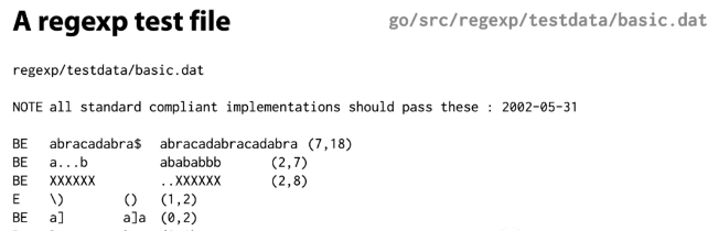 作为另一个例子,Go正则表达式包包含了一些从AT&T POSIX正则表达式库复制过来的testdata文件。我不会在这里详细介绍,但我很感激他们选择为该库使用基于文件的测试,因为这意味着我可以重用testdata文件,将其用于Go。这是另一种ad-hoc格式,但它易于解析和编辑。