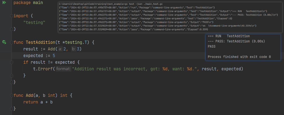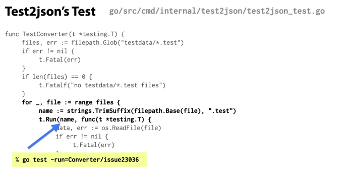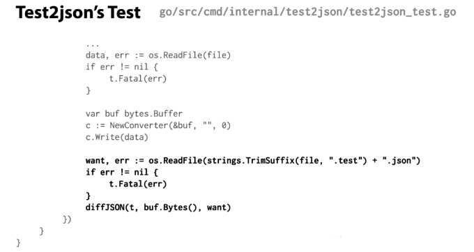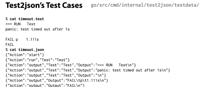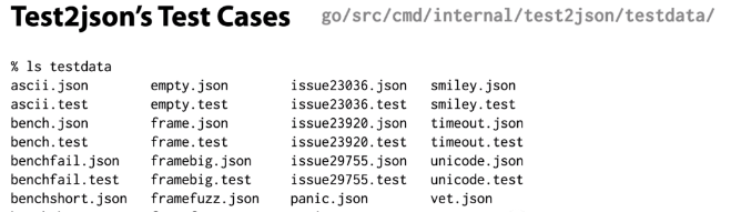 在文件中存储测试用例的另一种方法是使用成对的文件,一个用于输入,一个用于输出。为了实现go test -json,有一个名为test2json的程序,它读取测试输出并将其转换为JSON输出。测试数据是成对的文件:测试输出和JSON输出。