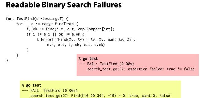 我认为我们都同意粉色框不是一个好的失败。但是黄色框中有两个细节使得这些失败尤为出色。首先,我们在单个if语句中检查了两个返回值,然后在简洁的单行中打印了完整的输入和输出。其次,我们不会在第一个失败处停止。我们使用t.Error而不是t.Fatal,以便执行更多的测试用例。结合起来,这两个选择让我们可以看到每个失败的完整细节,并在多个失败中寻找模式。