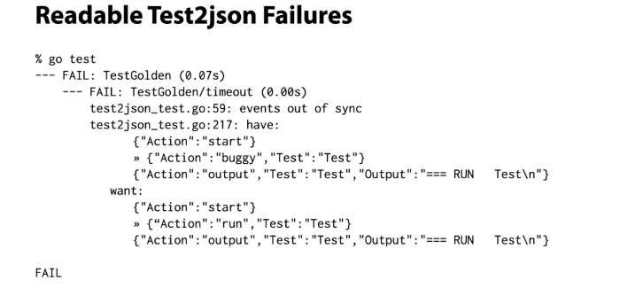 回到test2json,这是它的测试失败的情况。它计算出哪些事件是不同的,并清晰地标记它们。重要的是,在你编写测试时,你不必写这种复杂的代码。bytes.Equal在开始时是可以的,并且可以专注于代码。但是随着失败变得更加微妙,并且你发现自己花费太多时间只是阅读失败输出,这是一个好的信号,它告诉你是时候花一些时间使其更易读了。此外,如果确切的输出发生更改并且你需要更正所有的测试数据文件,这种类型的测试可能会有点麻烦。
