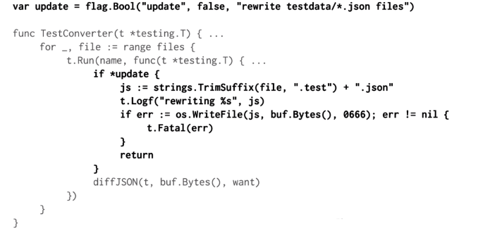 测试定义了一个新的“-update标志”。当标志为true时,测试将计算的答案写入答案文件,而不是调用diffJSON。现在,当我们对JSON格式进行有意的更改时,“go test -update”会更新所有答案。你还可以使用版本控制工具如“git diff”来审查更改,并在看起来不正确时撤销更改。在谈论测试文件的主题上,有时将一个测试用例分割成多个文件会很烦人。如果我今天编写这个测试,我就不会这样做。