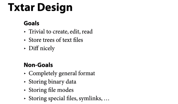 Txtar的设计有三个目标。首先,足够简单,可以手动创建、编辑和阅读。其次,能够存储文本文件的树形结构,因为我们在go命令中需要这个功能。第三,能够在git历史记录和代码审查中进行良好的差异比较。其他的包括成为完全通用的存档格式、存储二进制数据、存储文件模式(file mode)、存储符号链接等都不是目标,因为存档文件(archived file)格式往往变得十分复杂,而复杂性与第一个目标直接相矛盾。这些目标和非目标导致了一个非常简单的格式。下面是一个示例:txtar文件以注释开头。