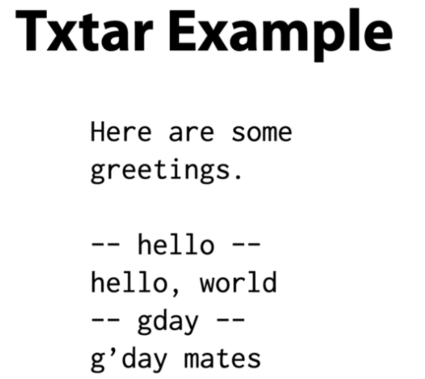 本例中为"Here are some greetings.",然后通常会有零个或多个文件,每个文件由形如"-- 文件名 --"的行引入。这个存档包含两个单行文件,hello和g'day。就是这样,这就是整个格式。没有转义,没有引用,没有对二进制数据的支持,没有符号链接,没有可能的语法错误,没有复杂之处。下面是一个在测试数据中使用txtar文件的真实示例。