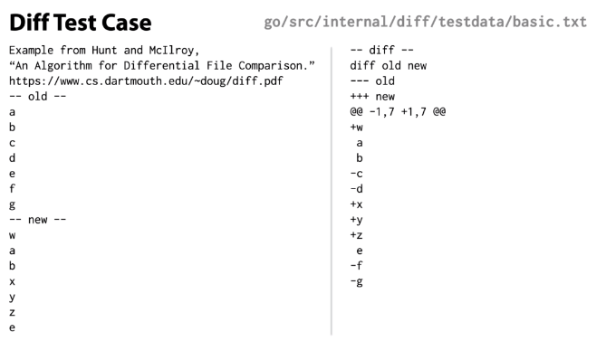 使用txtar文件几乎和编写它们一样简单。下面是我们之前查看的diff包的测试。