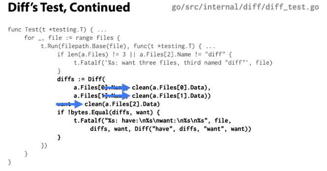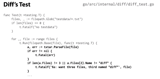 这是通常的基于文件的循环,但我们在文件上调用了txtar.ParseFile。然后我们坚持认为存档包含三个文件,第三个文件的名称为diff。然后我们对两个输入文件进行差异比较,并检查结果是否与预期的差异匹配。