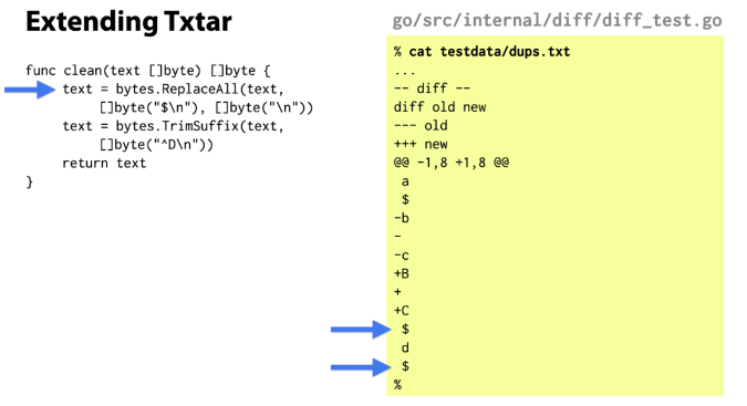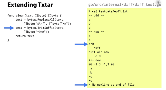 此外,txtar要求文件中的每一行都以换行符结尾,但我们希望测试diff在不以换行符结尾的文件上的行为。因此,测试允许在结尾处放置一个字面意义上的“尖号D”。clean函数会删除“尖号D”和其后的换行符。在这种情况下,'new'文件最终没有最后的换行符,而diff正确报告了这一点。因此,尽管txtar非常简单,你也可以轻松地在其上添加自己的格式调整。当然,重要的是要记录这些调整,以便下一个参与测试的人能够理解它们。