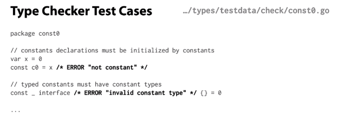 这里是对现有格式进行注释的一个示例。这是Go类型检查器(type checker)的一个测试。这是一个普通的Go输入文件,但是期望的类型错误已经以/ERROR/注释的形式添加了进去。我们使用/*注释,这样我们就可以将它们放置在错误报告的确切位置上。测试运行类型检查器,并检查它是否在预期位置产生了预期的消息,并且没有产生任何意外的消息。下面是类型检查器的另一个示例。