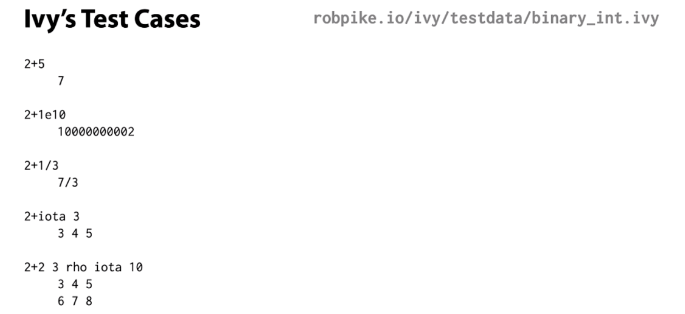 Ivy是一个交互式计算器。你输入程序,通常是简单的表达式,它会打印出答案。测试用例是看起来像这样的文件:未缩进的行是Ivy的输入,缩进的行是注释,指示Ivy应该打印出预期的输出。编写新的测试用例再也没有比这更简单的了。这些带注释的格式扩展了现有的解析器和打印器(printer)。有时编写自己的解析器和打印器是有帮助的。毕竟,大多数测试涉及创建或检查数据,当你可以使用方便的形式处理数据时,这些测试总是可以更好。