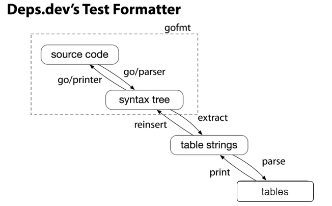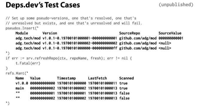因此,为了支持这个测试,deps.dev团队还有一个专门为这些测试编写的代码格式化程序。它使用Go标准库解析测试源代码文件。然后它遍历Go语法树,查找Insert或Want的调用。它提取字符串参数并将它们解析为表格。然后它将表格重新打印为字符串,将字符串重新插入语法树中,并重新打印语法树为Go源代码。这只是gofmt的一个扩展版本,使用了与gofmt相同的包。我这里不会展示这些代码,但代码量其实不多。