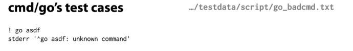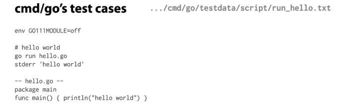 现在我想向你展示一些我曾经参与的最高质量的测试,这些测试是针对go命令的测试。它们将我们到目前为止看到的许多思想汇集在一起。这是一个简单但真实的go命令测试。这是一个txtar输入,其中包含一个名为hello.go的文件。archive comment是一个逐行简单命令语言编写的脚本。在脚本中,"env"设置一个环境变量来关闭Go module机制。井号引入注释。而"go"运行go命令,它应该运行hello world。该程序应该将hello world打印到标准错误中。"stderr"命令检查前一个命令打印的标准错误流是否与正则表达式匹配。因此,这个测试运行"go run hello.go"并检查它是否将hello world打印到标准错误中。