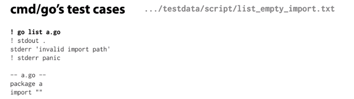 这里是另一个真实的测试。请注意底部的a.go是一个无效的程序,因为它导入了一个空字符串。第一行开头的感叹号是一个"非"操作符。NOT go list a.go意味着go list a.go应该失败。下一行的"NOT stdout ."表示标准输出不应该有与正则表达式"."匹配的内容,也就是不应该打印任何文本。接下来,标准错误流应该有一个无效的导入路径的消息。最后,不应该发生panic。