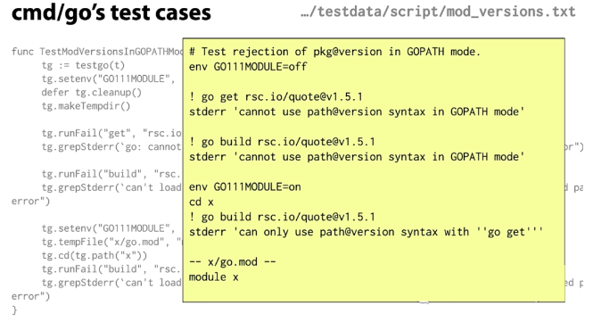 这些测试脚本取代了一个更传统的使用方法(method)的测试框架。这张幻灯片展示了其中一个真实的测试,前面是脚本编写的测试用例,后面是等价的Go编写的传统测试代码。细节并不重要,只需注意脚本要比传统测试方法更容易编写和理解。