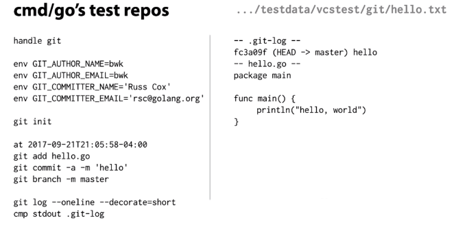 提取脚本引擎的动机是为了在go命令测试的不同部分中重用它。这个脚本正在准备一个包含我们想要在常规go命令脚本测试中导入的模块的Git存储库(repo)。你可以看到它设置了一些环境变量,运行了真正的git init,设置了时间,在存储库中运行了更多的git命令来添加一个hello world文件,然后检查我们得到了我们想要的存储库。再一次,测试并不是从一开始就是这样的,这引出了下一个实用建议。