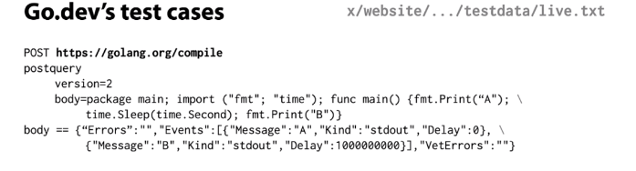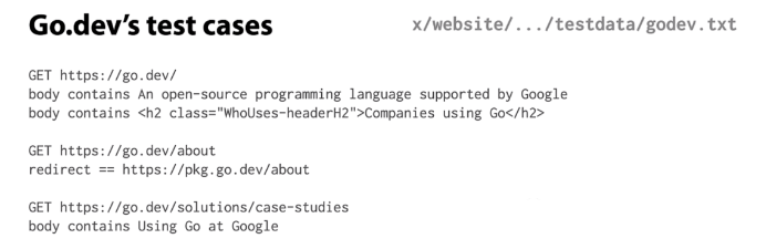 我之前提到过Go官方网站[7]使用了持续部署。在每次提交时,我们运行测试来决定是否可以部署最新版本的代码并将流量路由到它。此时,你不会感到惊讶,我们为这些测试编写了一个测试脚本语言。上图是它们的样子。每个测试以一个HTTP请求开始。这里我们GET主页go.dev。然后对响应进行断言。每个断言的形式为"字段(field),运算符(operator),值(value)"。这里字段(field)是body,运算符(operator是contains,值(value)是body中必须包含的字面值。这个测试检查页面是否渲染过了,因此它检查基本文本以及一个副标题。为了更容易编写测试,根本没有引号。值就是运算符后面的其余部分。接下来是另一个测试用例。出于历史原因,/about需要重定向到pkg.go.dev。