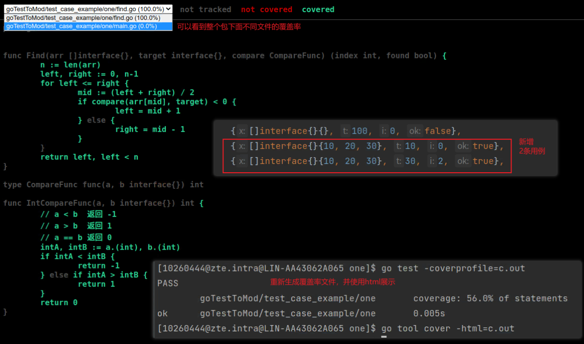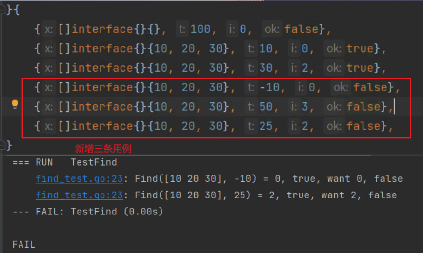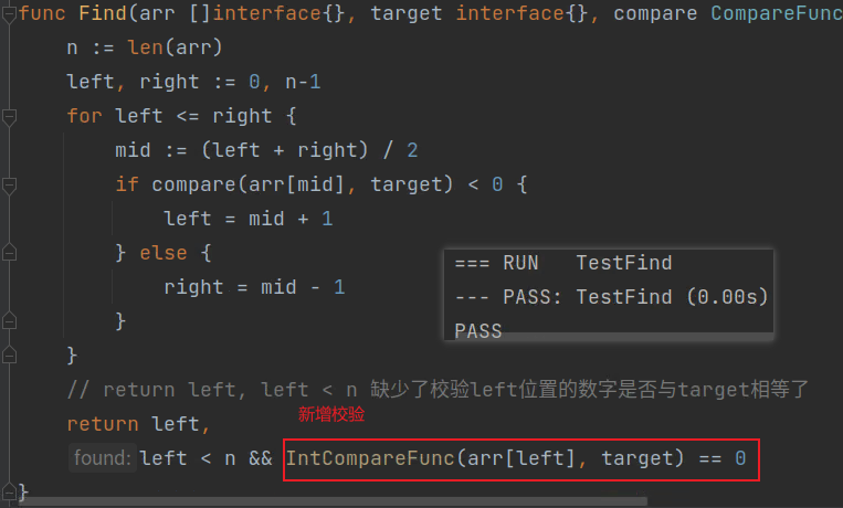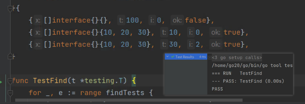 i, ok := Find(x, t, IntCompareFunc) // 5. 执行测试函数