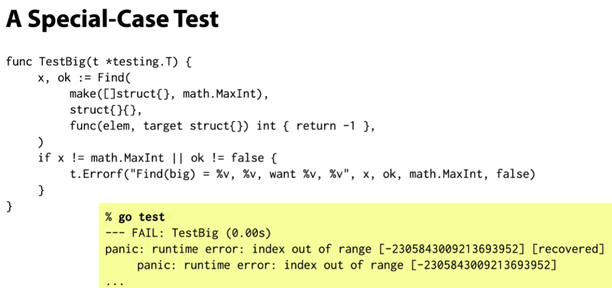 为了测试这种情况,一种可能性是编写一个仅在32位系统上运行的测试,对两千兆字节的uint8进行二分查找。但这需要大量的内存,并且我们现在已经没有多少32位系统了。对于测试这种难以找到的bug,通常还有更巧妙的解决方案。我们可以创建一个空结构体的切片,无论它有多长,都不会占用内存。这个测试在一个包含MaxInt个空结构体的切片上调用Find函数,寻找一个空结构体作为目标,但是它传入了一个总是返回-1的比较函数,声称切片元素小于目标。这将使二分查找探索越来越大的切片索引,从而导致溢出问题。如果我们撤销我们的修复并运行这个测试,那么测试肯定会失败。