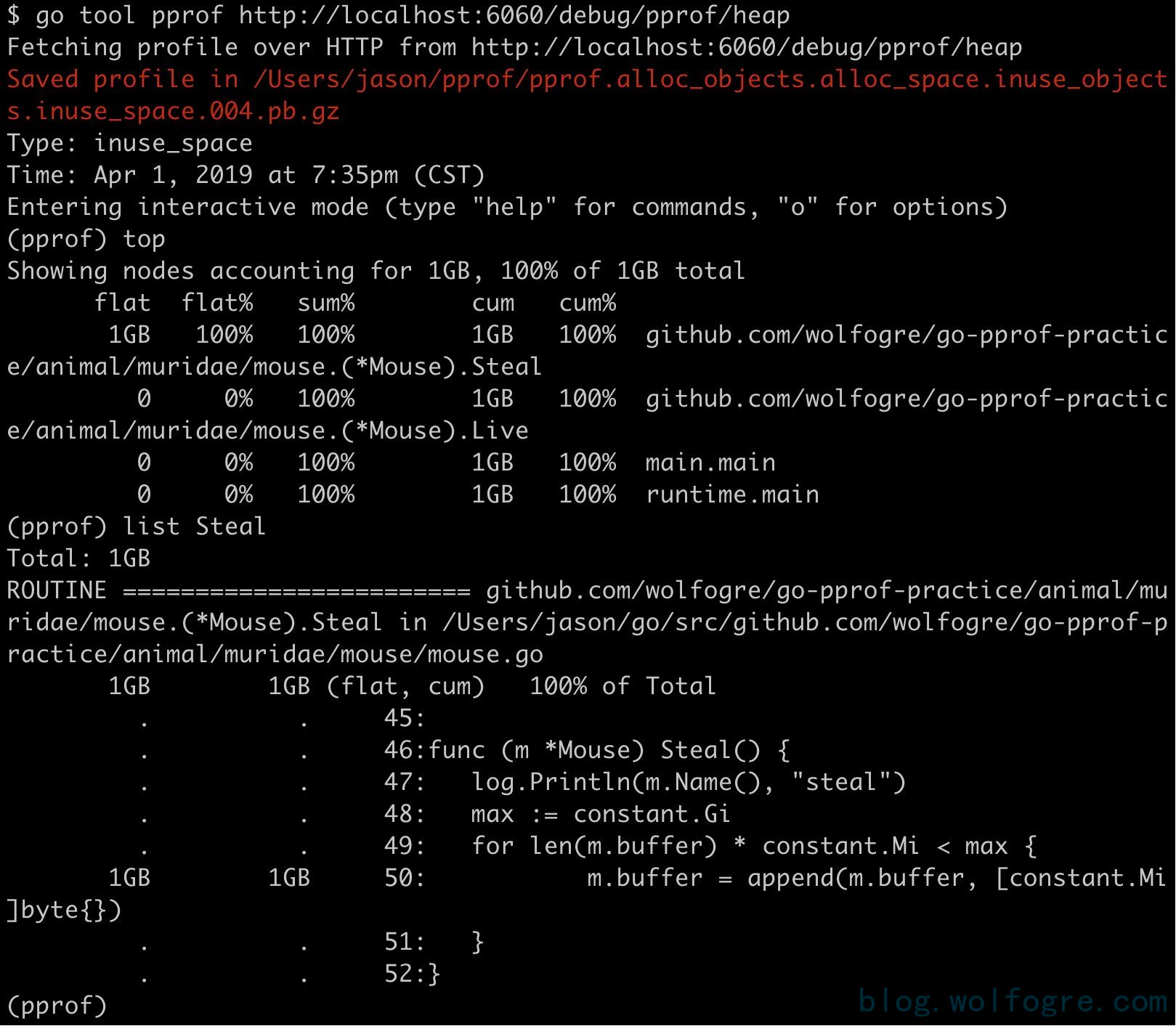 可以看到这次出问题的地方在 github.com/wolfogre/go-pprof-practice/animal/muridae/mouse.(*Mouse).Steal,函数内容如下: