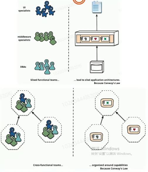 事实上传统应用设计架构的分层结构正反映了不同角色的沟通结构。所以若要按微服务的方式来构建应用,也需要对用调整团队的组织架构。每个微服务背后的小团队的组织是跨功能的,包含实现业务的所需的全面技能。